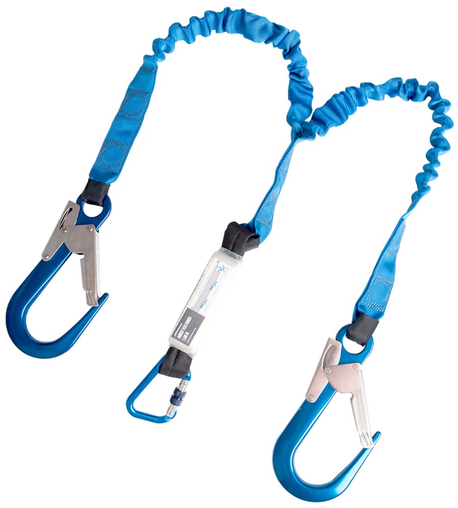 Elastische vanglijn: 1,0 m in rust en 1,5 m als volledig uitgerekt. Voorzien van een aluminium karabijnhaak met schroefsluiting en twee aluminium steigerhaken. Biedt comfort en 100% veiligheid als de gebruiker zich moet voortbewegen van ankerpunt naar ankerpunt.