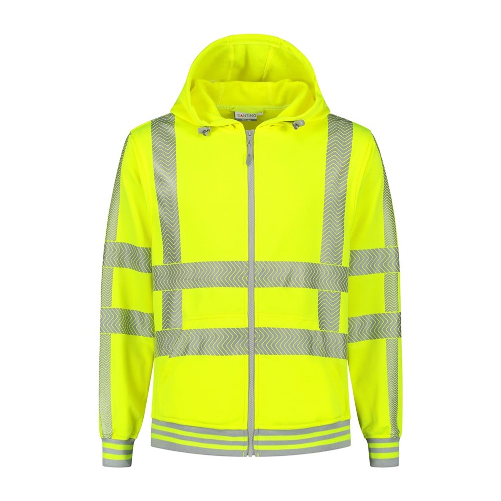 Sweatvest met capuchon, 100% polyester, 270 gr/m², french terry met geruwde binnenzijde, regular fit met capuchon met koord en stoppers, tailleband, 1x1 rib en 2 x contrasterende tipping en YKK vislon ritsen, kangoeroe zakken, ribboord en -manchetten met contrasttipping en getransfereerde gesegmenteerde zilver reflectie tape in RWS configuratie. Gecertificeerd volgens EN ISO 13688/EN ISO 20471. Voldoet aan de RWS voorschrift.